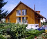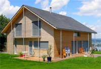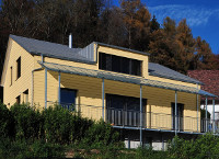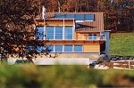 Holz-Elementbauweise in Fichtenholz auf massivem Untergeschoss. Hochwärmegedämmte GebäudehÜlle. An sehr starker Hanglage. Wärmeerzeugung mit Wärmepumpe und Erdsonde. Sonnenkollektoren zur Warmwassererzeugung und Heizungsunterstützung. Wärmeabgabe über selbstregulierende Niedertemperatur-Bodenheizung. Komfortlüftung.