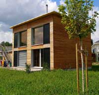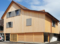 Mischbauweise: Optimal gedämmte Holzelemente auf Beton-Massivbau. Aussenschalung in Lärche unbehandelt. Carport als freistehender Baukörper mit darüberliegender Terrasse. Das Wohnhaus ist exakt quadratisch aufgebaut. Der Schlaf- und Bürobereich ist im Erdeschoss, der Wohnbereich im Obergeschoss. Die Wärmeerzeugung erfolgt über einen Holzofen im Obergeschoss. Wärmeverteilung mit Betonkern-Bodenheizung. Die Warmwasser-Erzeugung wird über Sonnenkollektoren und über den Holzofen betrieben. Komfort-Lüftung in allen Räumen. Regenwassernutzung für die WC-Anlage und den Gartenbereich.