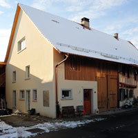Neue Aussenhaut auf die bestehende Holzkonstruktion. Beibehaltung der äusseren Strukturen (Kernzone). Optimale U-Werte. Die bestehende Jauchegrube dient als Regenwasser-Reservoir. Pellet-Heizung. Warmwasser-Erzeugung mit Sonnenkollektoren.