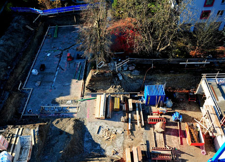 Stand 25.11.2013: Im Süden: Die Kanalisation für Haus C ist fertig, die Bodenplatte wird vorbereitet.