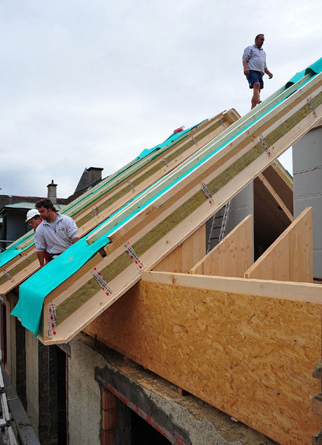 Hochgedämmte Holzelemente werden fachgerecht versetzt ...