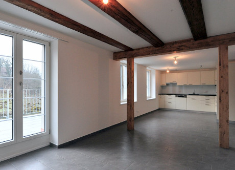 Wohnen, Essen mit Küche im Obergeschoss mit direktem Ausgang auf die grosszügige Terrasse.